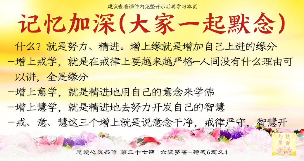 我们因为能够学到佛,才会在“增上”上面下功夫。增上是什么?就是努力、精进。增上缘是什么呢?就是增加自己上进的缘分。师父把这个“增上”扩展讲给你们听,首先要增上戒学,就是在戒律上要越来越严格,不要去讲理由,不要去辨别、辩论,人间没有什么理由可以讲,全是缘分。今天还觉得自己有理的,还来辨别,这个人就根本不是一个好的学佛人。第二要增上意学,就是精进地用自己的意念来学佛。第三要增上慧学,就是精进地去努力开发自己的智慧。戒、意、慧这三个增上就是说意念干净,戒律严守,智慧开启,然后因缘成熟,自然成功,就会不起烦恼,心灵得解脱。所以,修行需要天时、地利、人和,需要缘分的成熟。