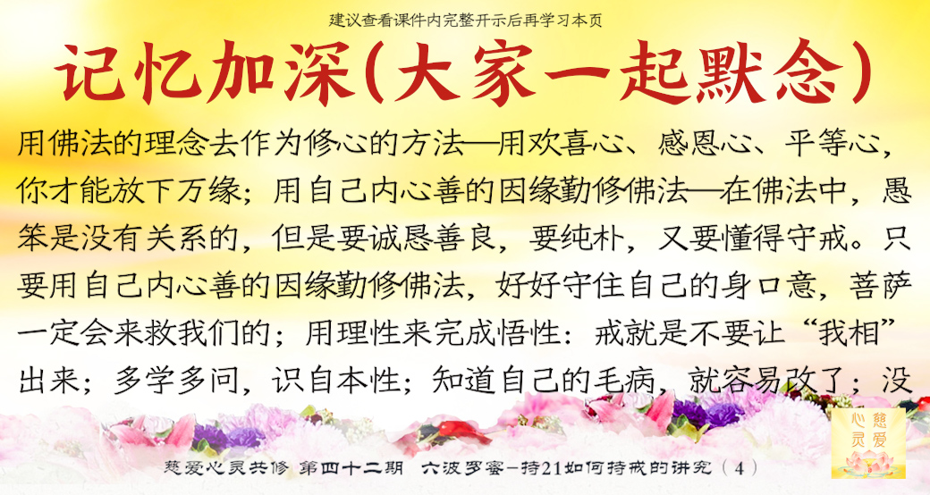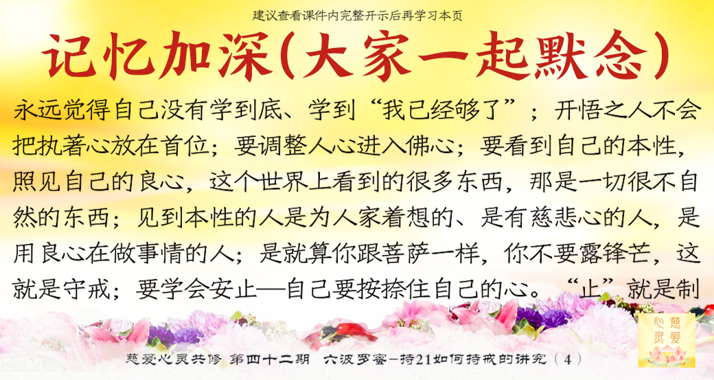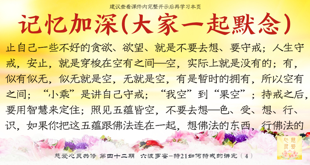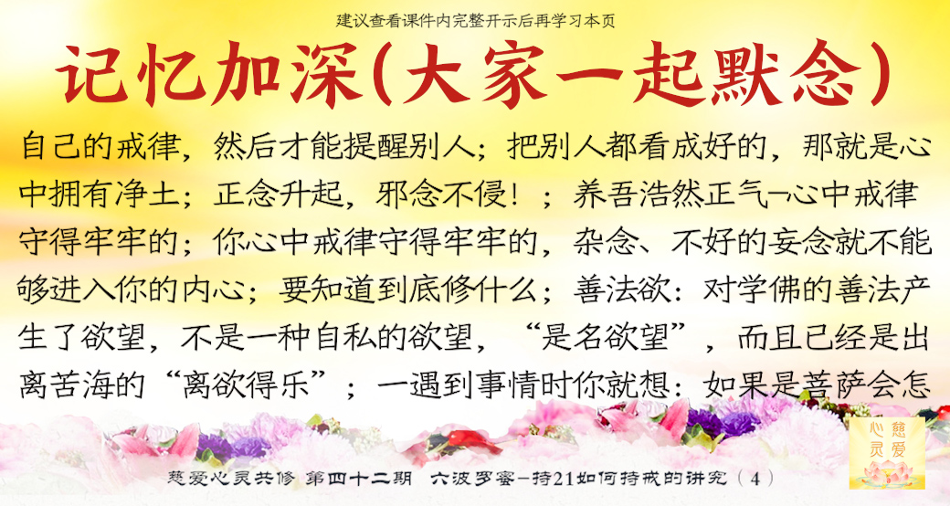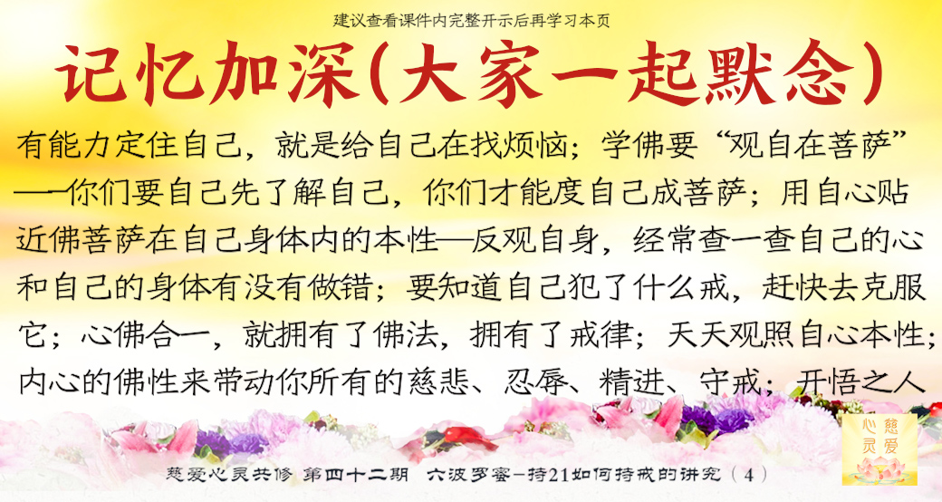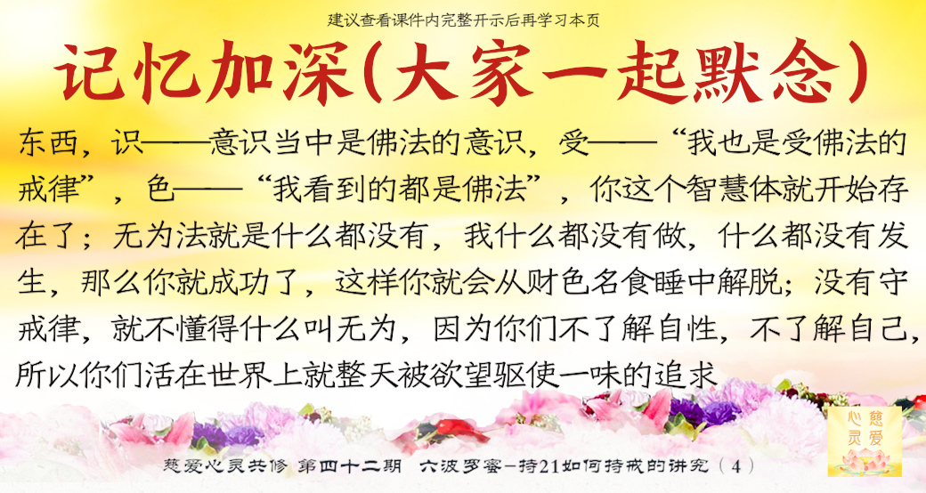 首先要学会戒,戒就是不要让“我相”出来,要用自己的理性来完成自己的悟性。理性是什么?“我明白这个道理,我不能做一个普通凡人,我不能去伤害别人,我今天给人家脸看,不是一个好好的学佛人——理性来了,那么完成自己的悟性,慢慢就开悟了。你整天给人家看脸,你会开悟吗?