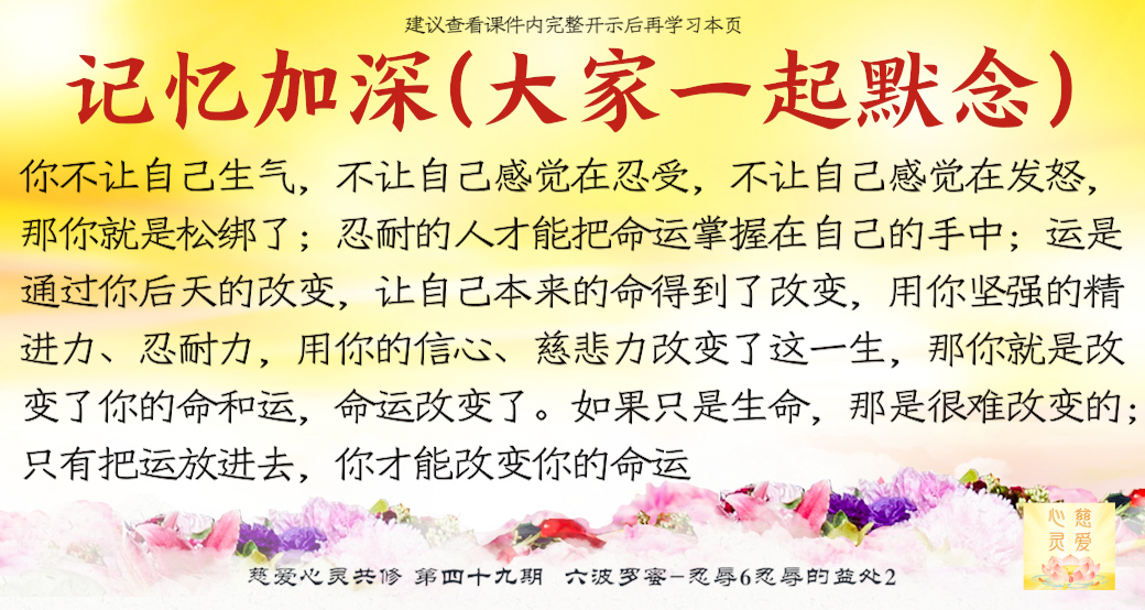 第一个阶段是相爱;过一段时间是争吵;第三个阶段就看你们自己的本事,谁有这两个字谁就能维持家庭,没有这两个字就家庭破裂,最后这两个字就是“忍耐”。...把别人往好的地方看,心中就拥有正能量,把别人往坏的地方看,就拥有负能量。